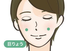 巨りょうとは、頬骨の下にあるツボのこと。上唇を引っ張る頬の筋肉を鍛える効果があるツボです。ほかにも口や目のゆがみであったり、頬のむくみやたるみを整えたりするツボでもあります。また、肌の皮脂分泌を整える効果もあるため、乾燥肌対策にも効果的。人差し指を使って左右同時に5秒ほど押し、ゆっくりと離します。これを5回程度繰り返しましょう。